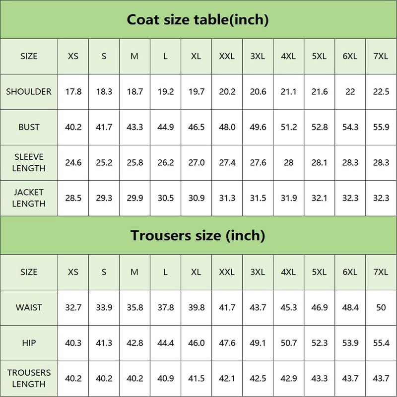 Größentabelle für Mäntel und Hosen in Zoll, grüne Tabelle, Größen XS bis 7XL.