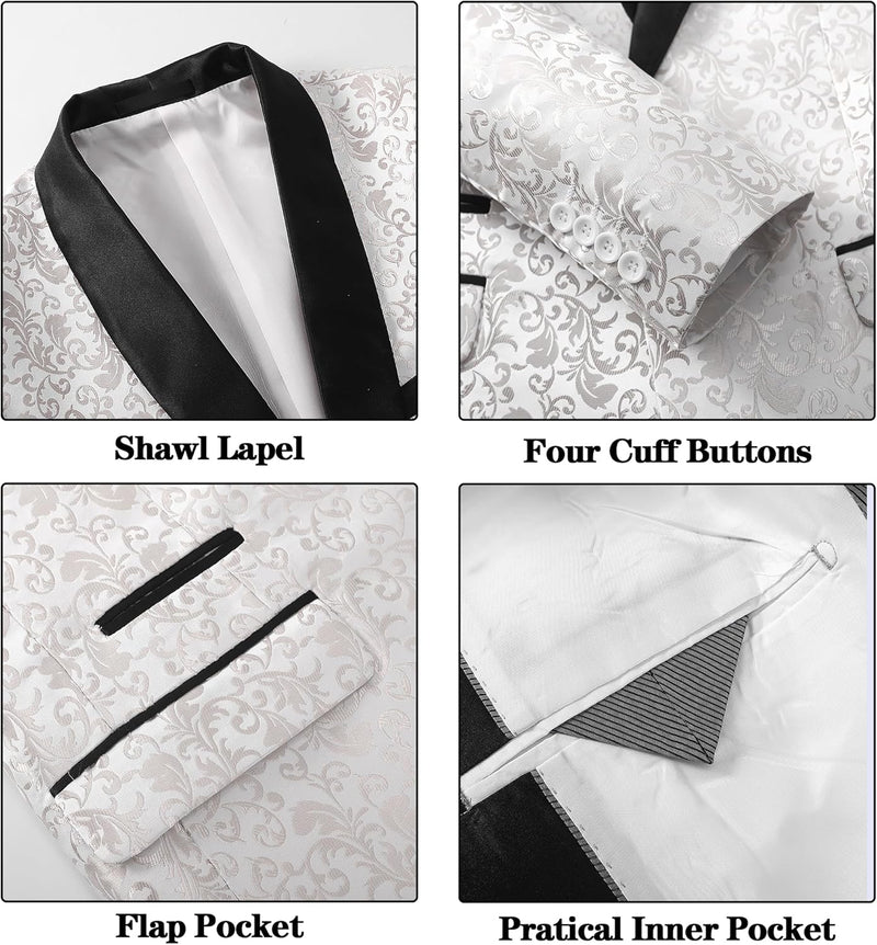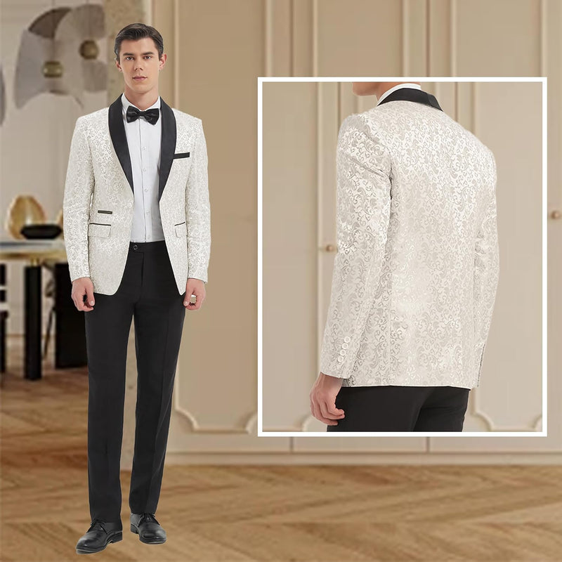 Weißer Smoking mit schwarzem Revers, florales Muster, Herrenanzug, festliche Mode.