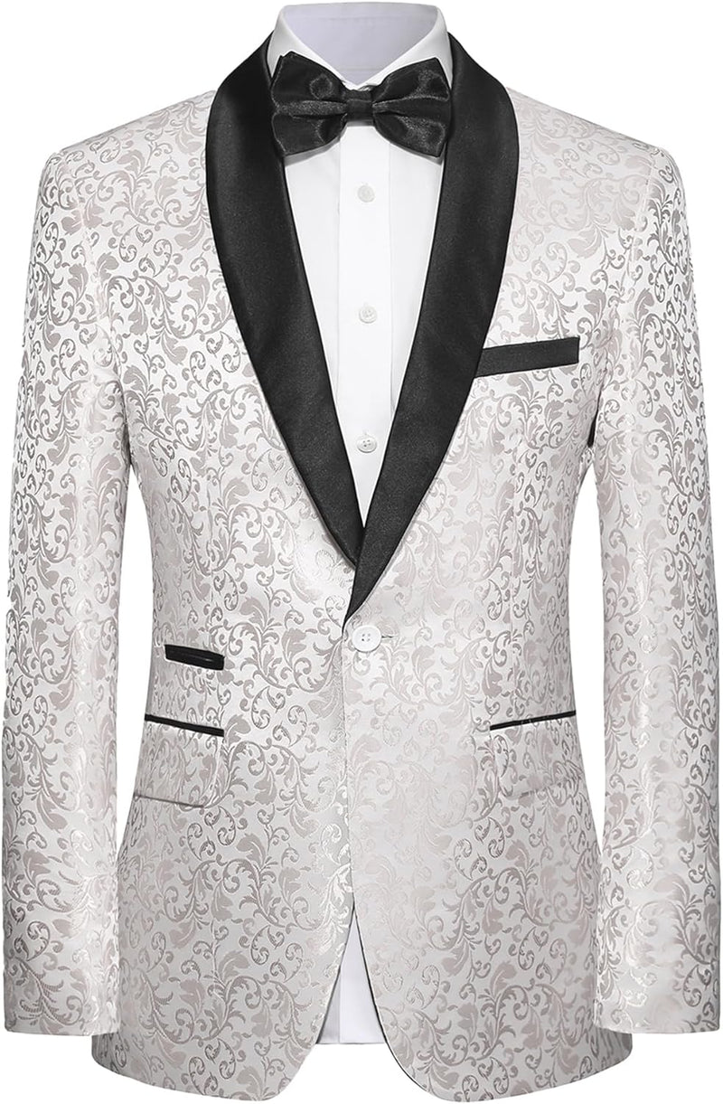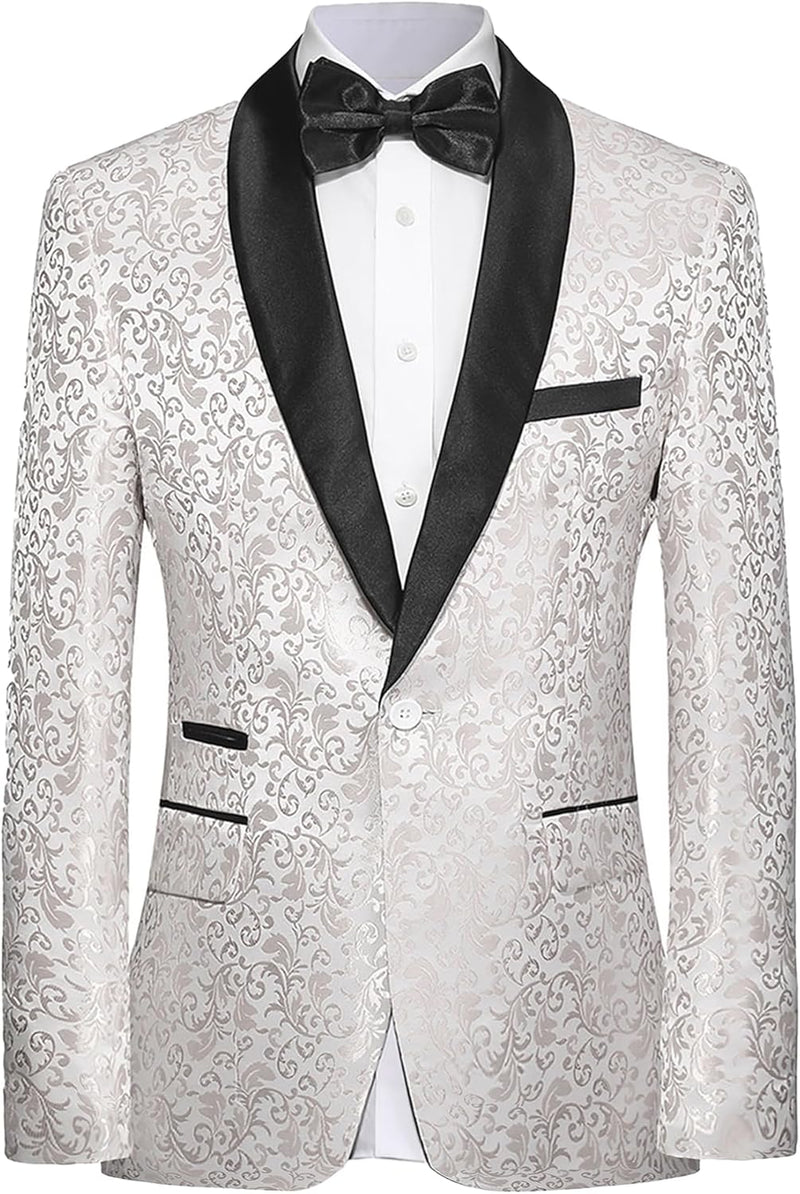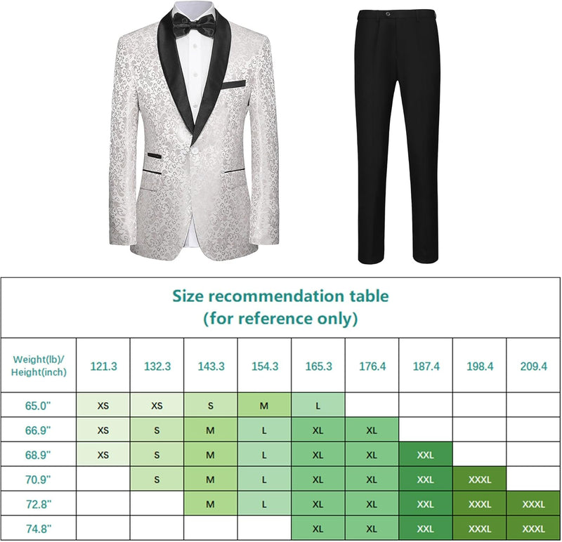 Weißer Smoking-Blazer mit schwarzem Revers, florales Muster, Herrenmode, Größentabelle.