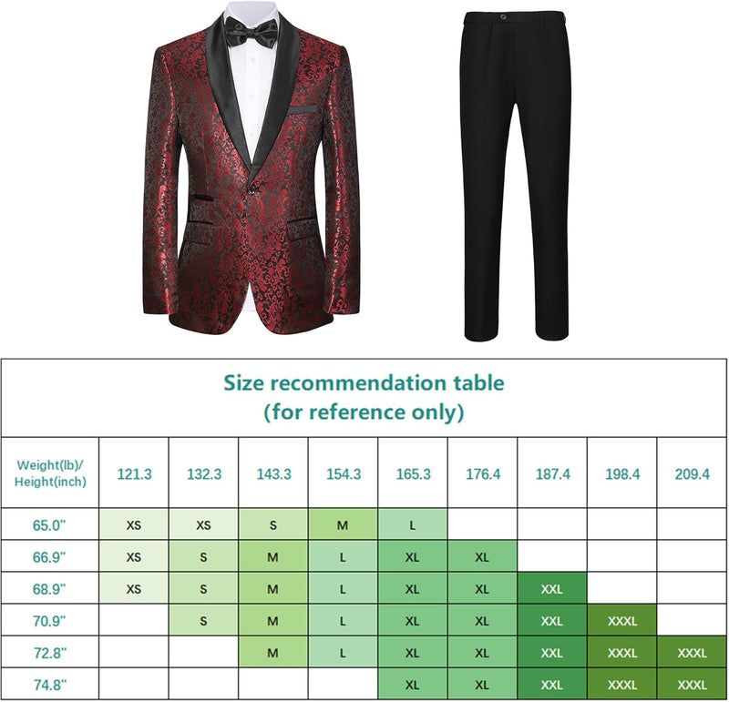 Roter Smoking mit schwarzem Revers, Herrenanzug, elegant, festlich, Größenempfehlungstabelle.