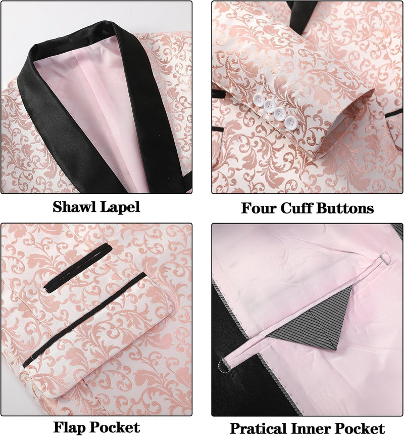 Herren Smoking Anzug, rosa Brokatjacke, schwarzer Revers, schwarze Hose, festliche Mode.