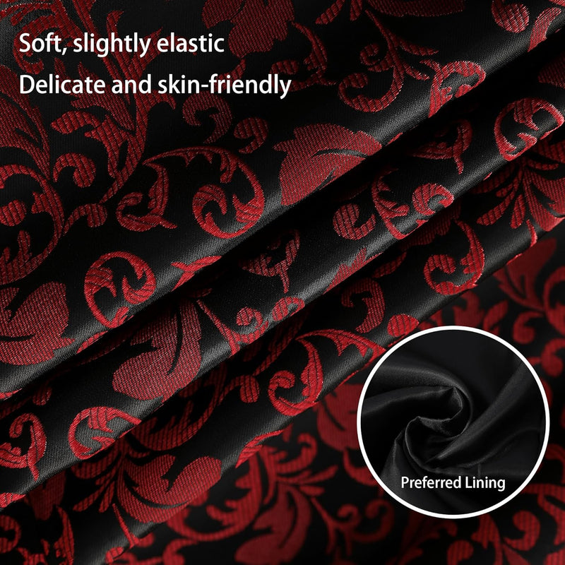 Roter Smoking mit schwarzem Paisley-Muster, Schalkragen, zwei Pattentaschen, elegante Knöpfe.