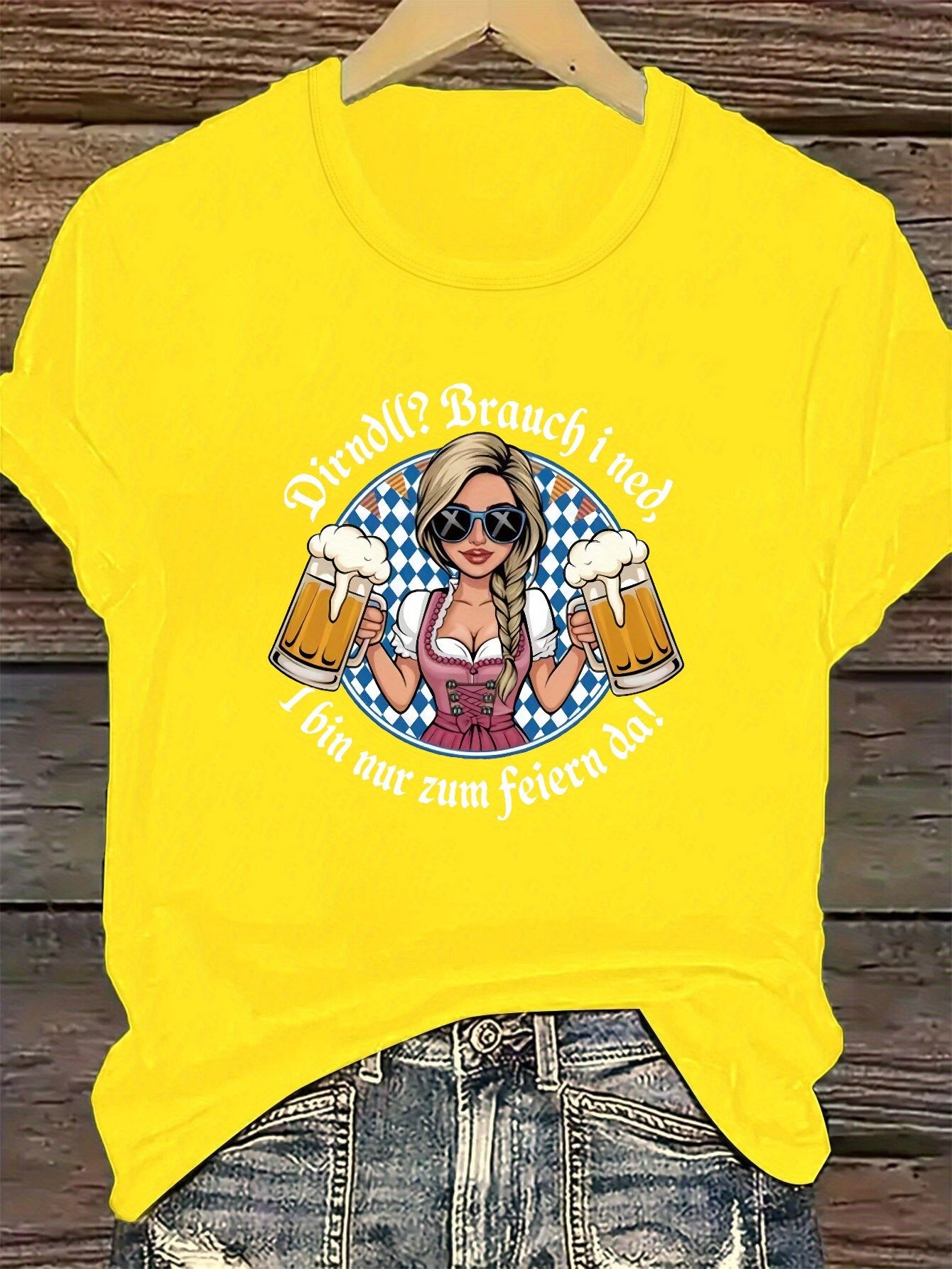 Mit dem Liesl T-Shirt bringst du Farbe und gute Laune ins Festzelt. Das strahlend gelbe Shirt mit dem frechen Biermädchen-Print und dem Spruch „Dirndl? Brauch i ned – i bin nur zum Feiern da!“ ist ein echter Hingucker. Dank seines leichten, elastischen Stoffes sitzt es bequem, auch an langen Tagen voller Tanz, Musik und guter Stimmung. Ob zur Jeans, Shorts oder Lederhose – dieses Shirt macht jeden Look zum Festoutfit.