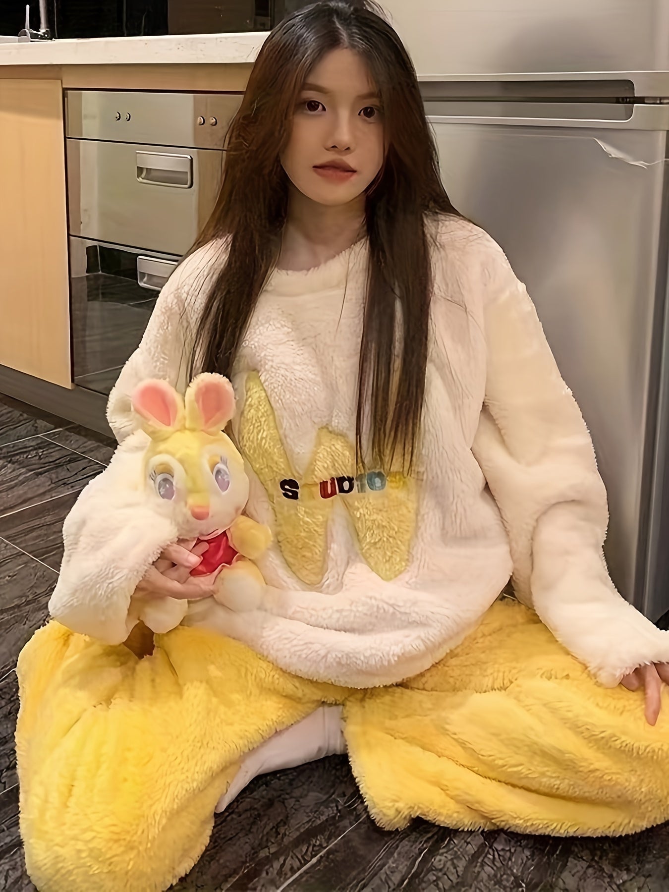 Damen Pyjama Set aus Fleece mit Stickerei & Rundhals für Herbst/Winter – Alissa