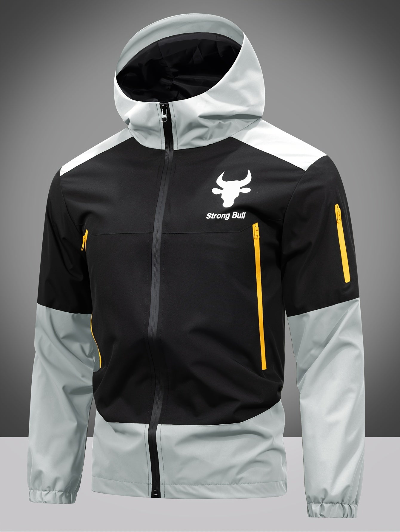 Schwarze und beige Outdoor-Jacke mit Kapuze, gelben Reißverschlüssen, "strong Bull" Logo.