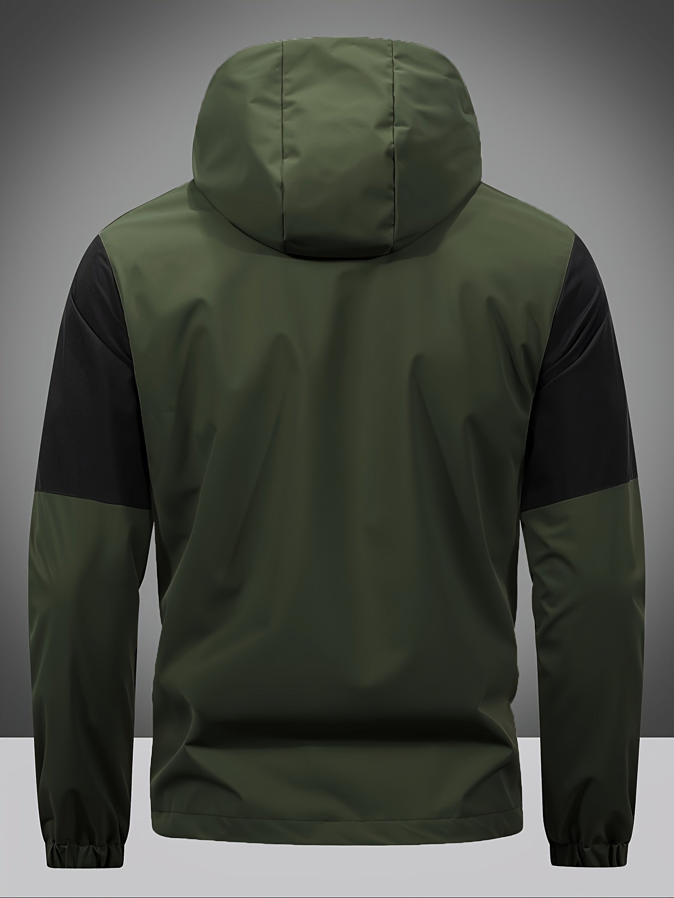 Grüne Herrenjacke mit Kapuze, wasserabweisend, schwarz abgesetzte Ärmel, Outdoor-Bekleidung.
