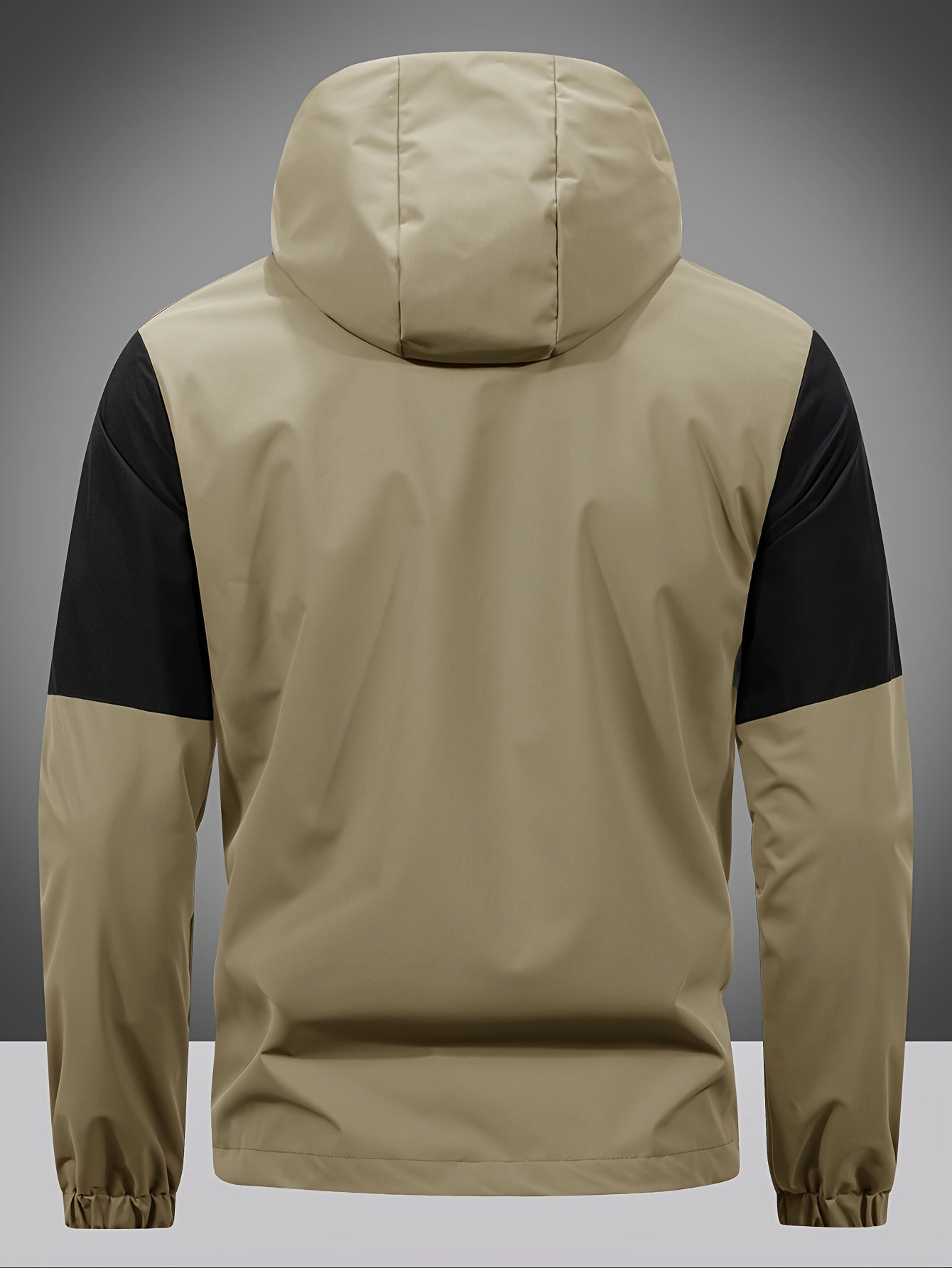 Beige und schwarze Herren-Windjacke mit Kapuze, wasserabweisend, Outdoor-Bekleidung.