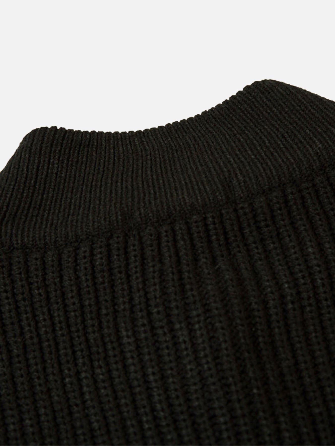 Schwarzer Strickpullover aus Wolle, Nahaufnahme, gerippter Kragen, modisch, warm, hochwertig.