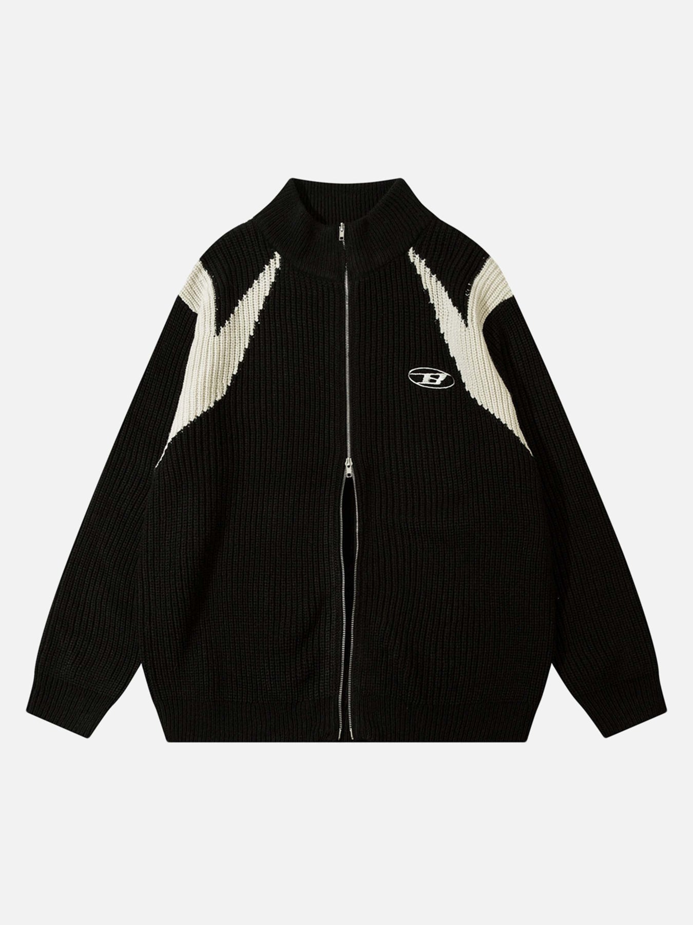 Schwarze Strickjacke mit Reißverschluss, weißen Streifen, Stehkragen, Herrenmode, Baumwolle.