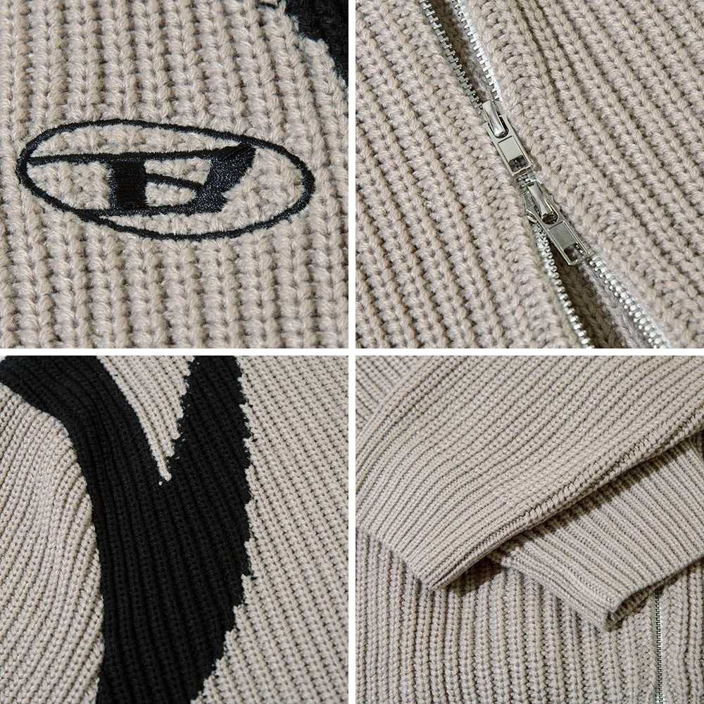 Beige Strickjacke mit Reißverschluss, Kontrastmuster, Herren Streetwear, Herbst Winter Mode.