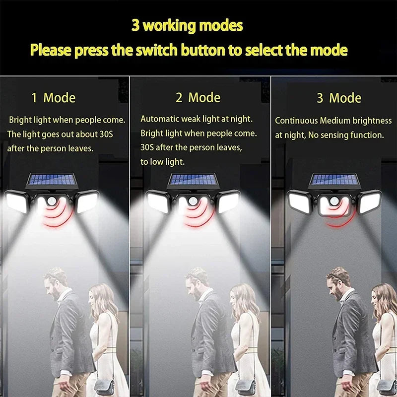 Solarbetriebene LED-Außenleuchte mit Bewegungsmelder, drei Modi, energiesparend.