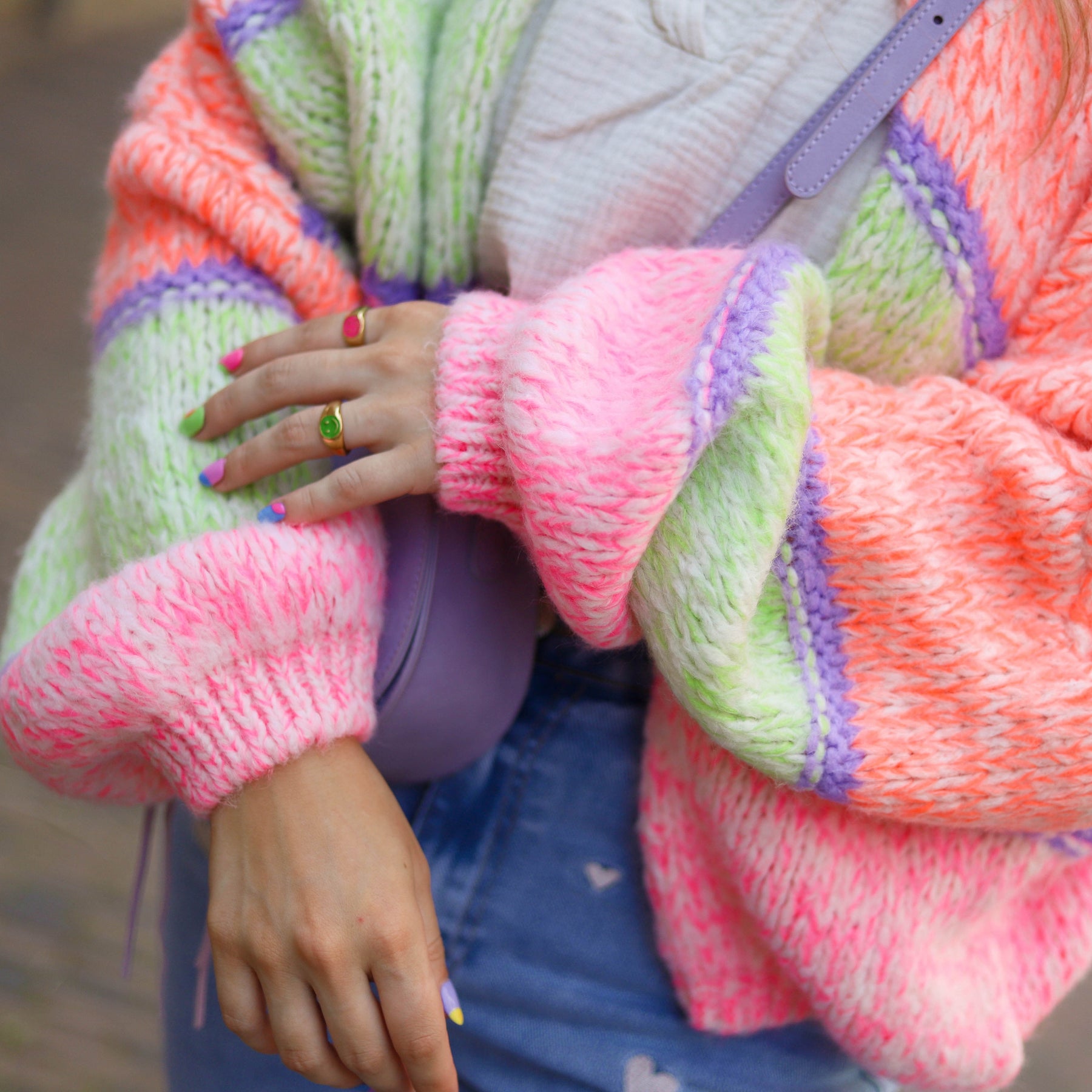 Bringen Sie mit der Livia Strickjacke einen Hauch von Fröhlichkeit in Ihre Garderobe. Diese wunderschöne Strickjacke mit einem verspielten Streifenmuster kombiniert die lebendigen Farben Orange, Grün, Rosa und Lila und ist damit die perfekte Wahl, um jedes Outfit aufzuhellen. Die Livia Strickjacke wurde entworfen, um Ihrem täglichen Look einen frischen, farbenfrohen Akzent zu verleihen, egal ob Sie sich für einen entspannten Tag oder einen besonderen Anlass entscheiden.