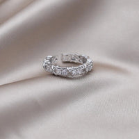 Silberner Ring mit Zirkonia-Steinen auf beigem Satin, eleganter Schmuck, Damenring, Geschenkidee.
