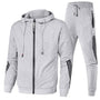 Grauer Herren-Trainingsanzug mit Kapuze, Reißverschluss und Streifen, Sportbekleidung.
