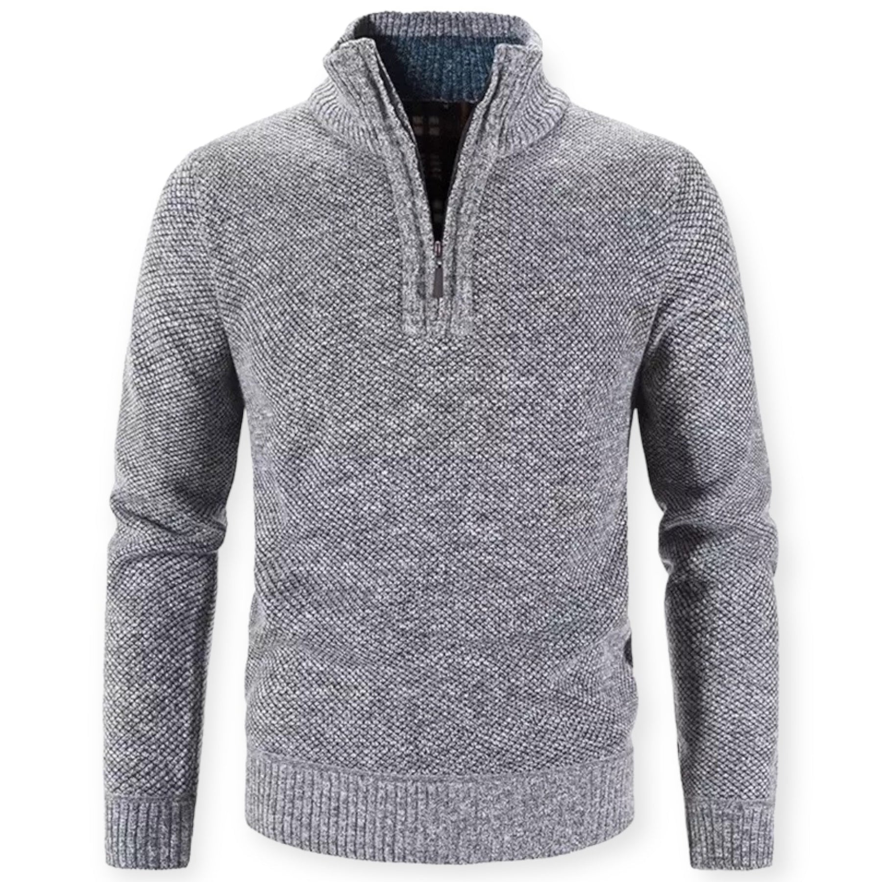 Grauer Herrenpullover mit Reißverschluss, Strick, warm, modisch, Winterkleidung.