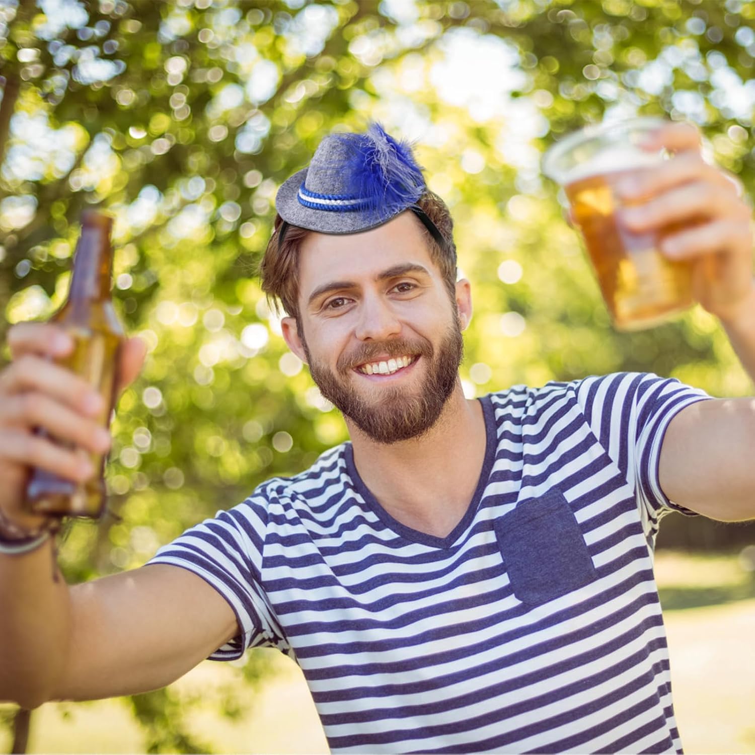 Die WiesnCharme Mini-Trachtenhüte sind das witzige Accessoire für dein perfektes Wiesn-Outfit. Jeder kleine Seppelhut ist fest an einem Haarreif befestigt und bleibt auch beim Tanzen, Feiern und Anstoßen sicher an Ort und Stelle. Mit grauem Filz, blauen Details und Feder-Deko passen sie perfekt zu Dirndl oder Trachtenlook. Dank der leichten Materialien sind sie angenehm zu tragen – sowohl für Erwachsene als auch für Kinder.
