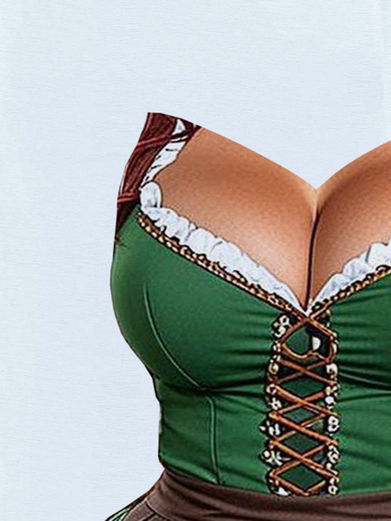 - Originelles Design: Realistischer Dirndl-Corsage-Print mit Lederhosen-Details