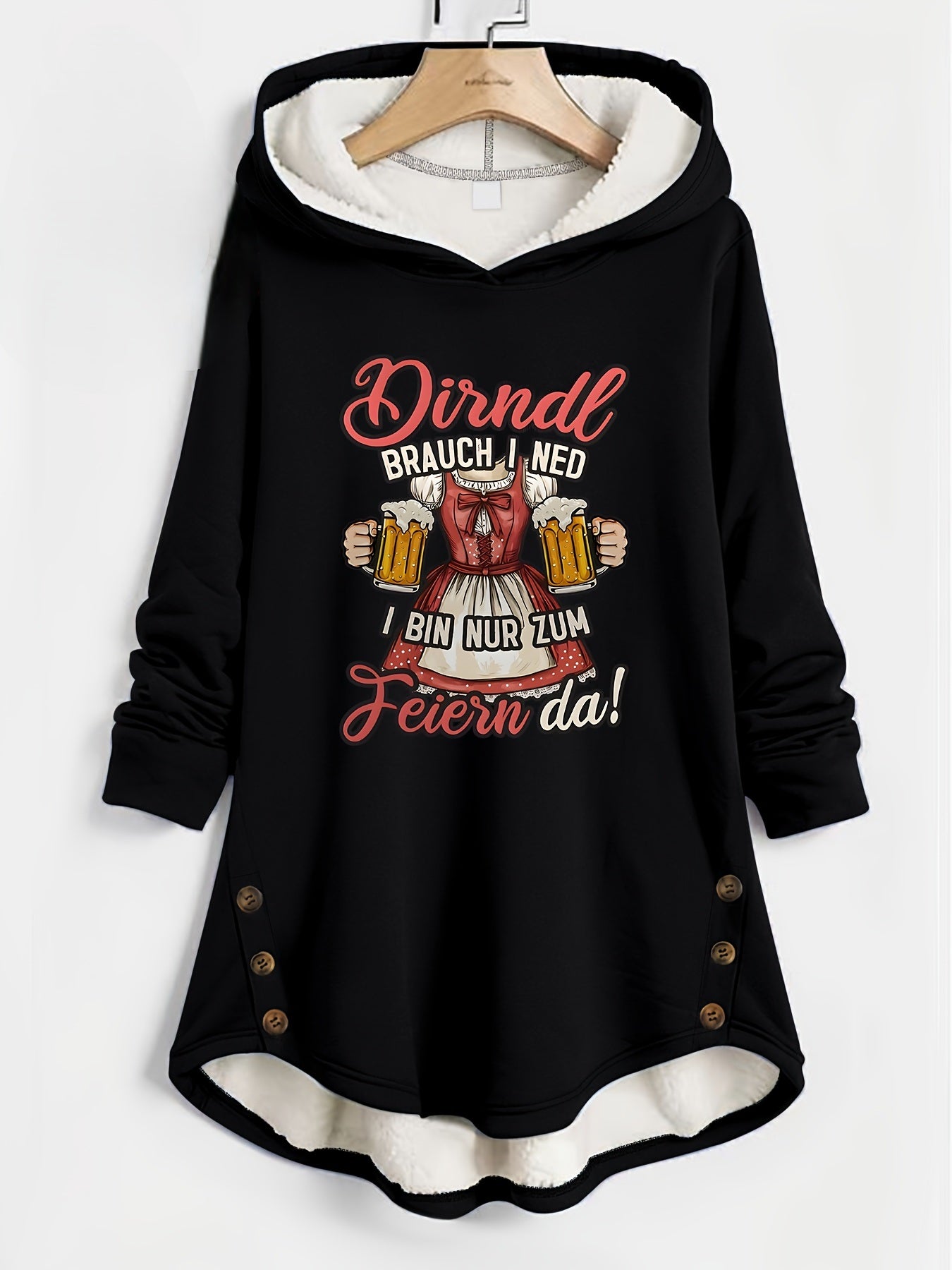 Der Sabine Hoodie vereint kuschelige Wärme mit einem humorvollen Oktoberfest-Print. Mit der Aufschrift „Dirndl brauch i ned – i bin nur zum Feiern da!“ und dem auffälligen Dirndl-Motiv setzt er ein klares Statement. Die weiche Innenfütterung, die seitlichen Knöpfe und die lockere Passform machen ihn zum idealen Begleiter für kalte Herbst- und Wintertage. Perfekt für Wiesn-Partys, gesellige Abende oder gemütliche Stunden zuhause.