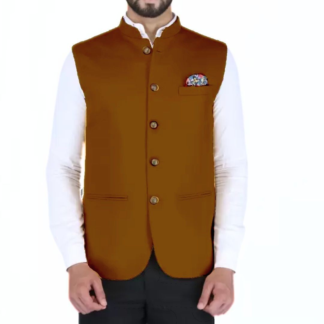 Männer Weste Braun, Stehkragen, Knöpfe, Einstecktuch, formell, elegant, Herrenmode.