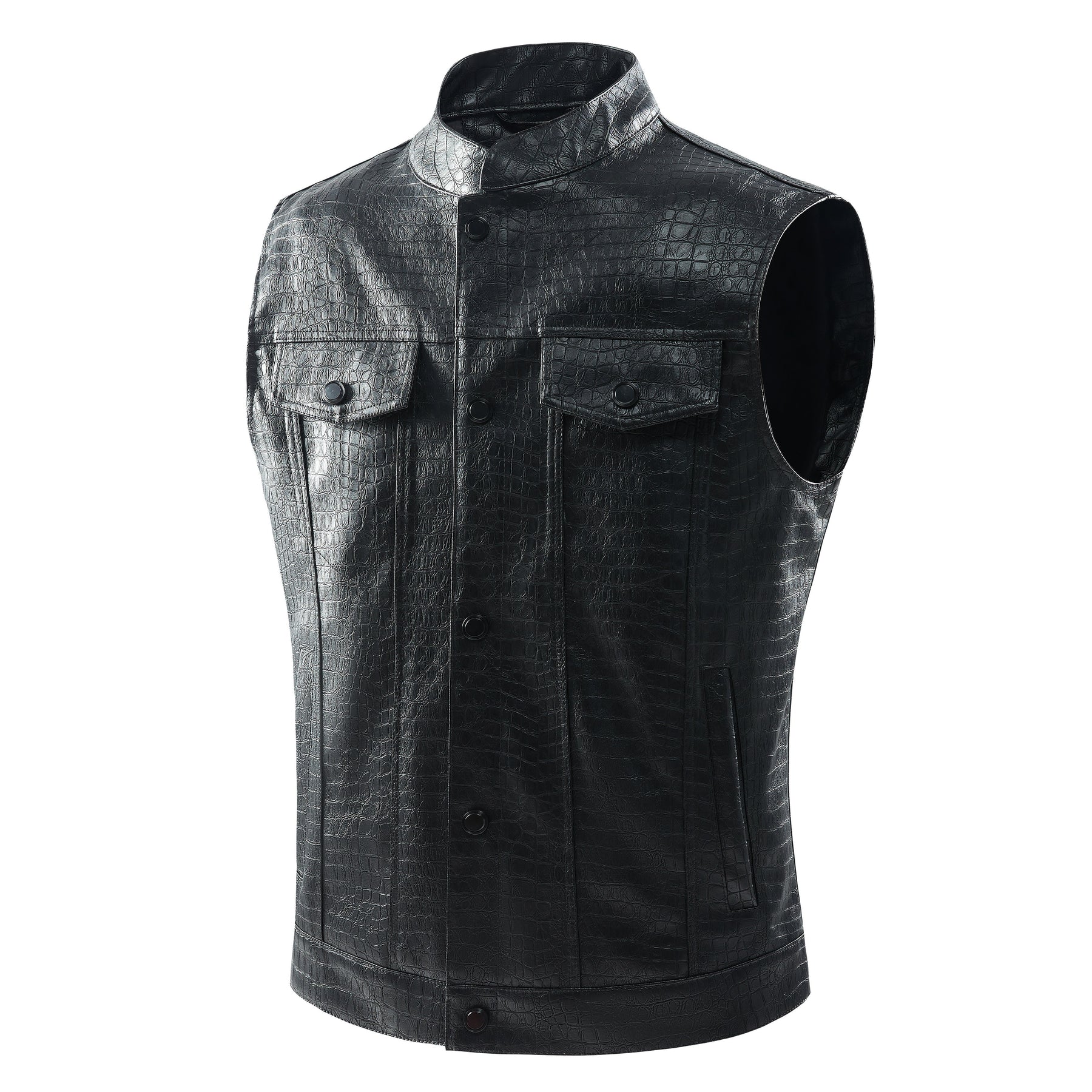 Schwarze Lederweste mit Krokodilprägung, ärmellos, Stehkragen, zwei Brusttaschen.