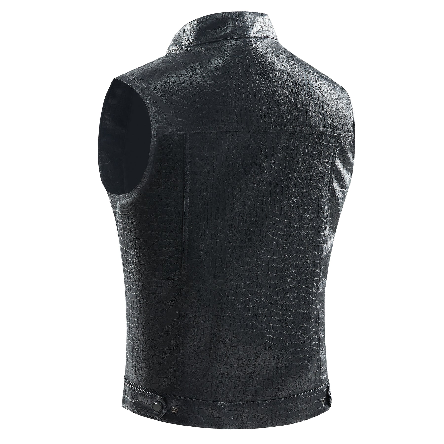 Schwarze Lederweste, ärmellos, Krokodilprägung, modisch, Herrenbekleidung, Rückansicht.