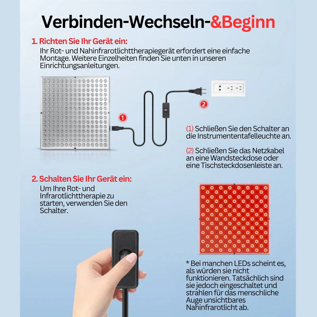 Anleitung zur Inbetriebnahme eines Rot- und Infrarotlichttherapiegeräts mit Netzanschluss.
