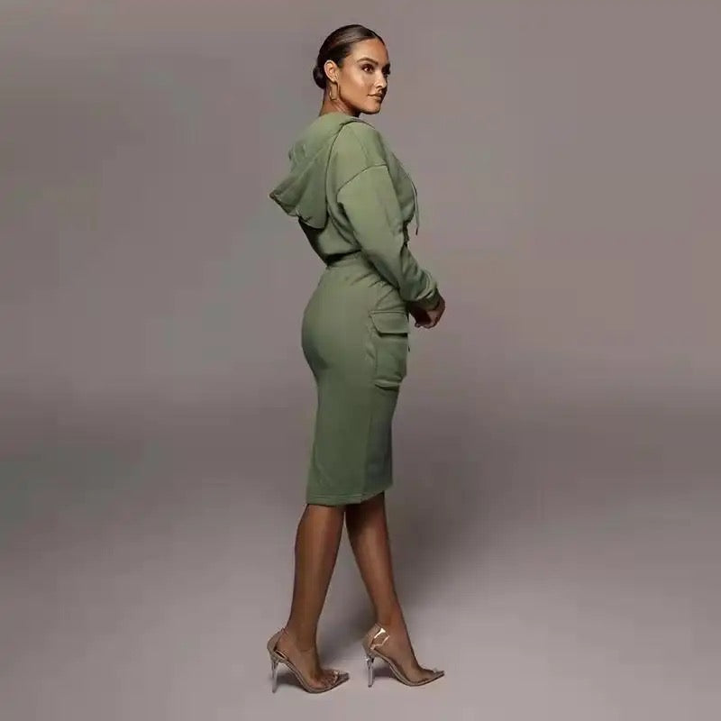 Frau in grünem Kapuzenpullover und Rock-Set, Freizeitmode, elegantes Design.