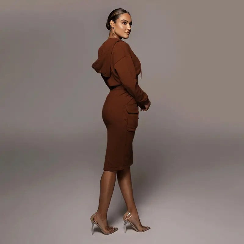 Frau in braunem Kapuzenkleid, elegantes Design, Herbstmode, Damenbekleidung, Freizeitlook.