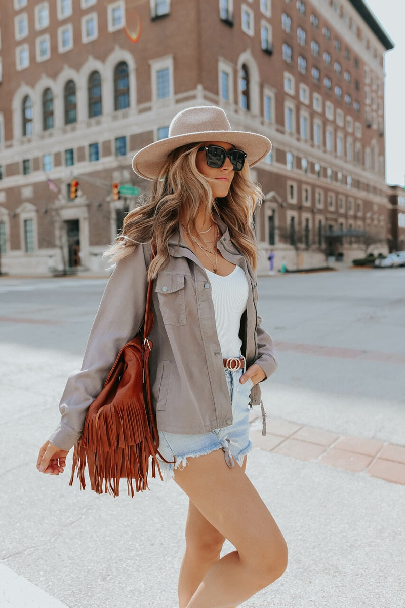 Frau in Sommeroutfit mit Hut, Sonnenbrille, Fransenledertasche, Jeansshorts auf Stadtstraße.