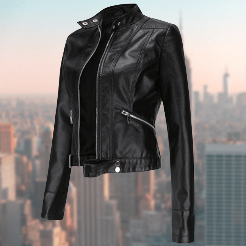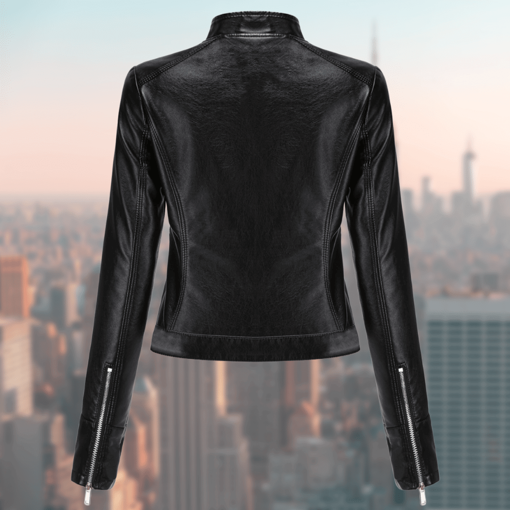 Schwarze Lederjacke für Damen, modisch, Reißverschluss, urbaner Hintergrund, stilvoll.