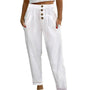 Weiße Damenhose mit Knöpfen, Leinen, Sommermode, elegant, lässig, bequem, modisch.