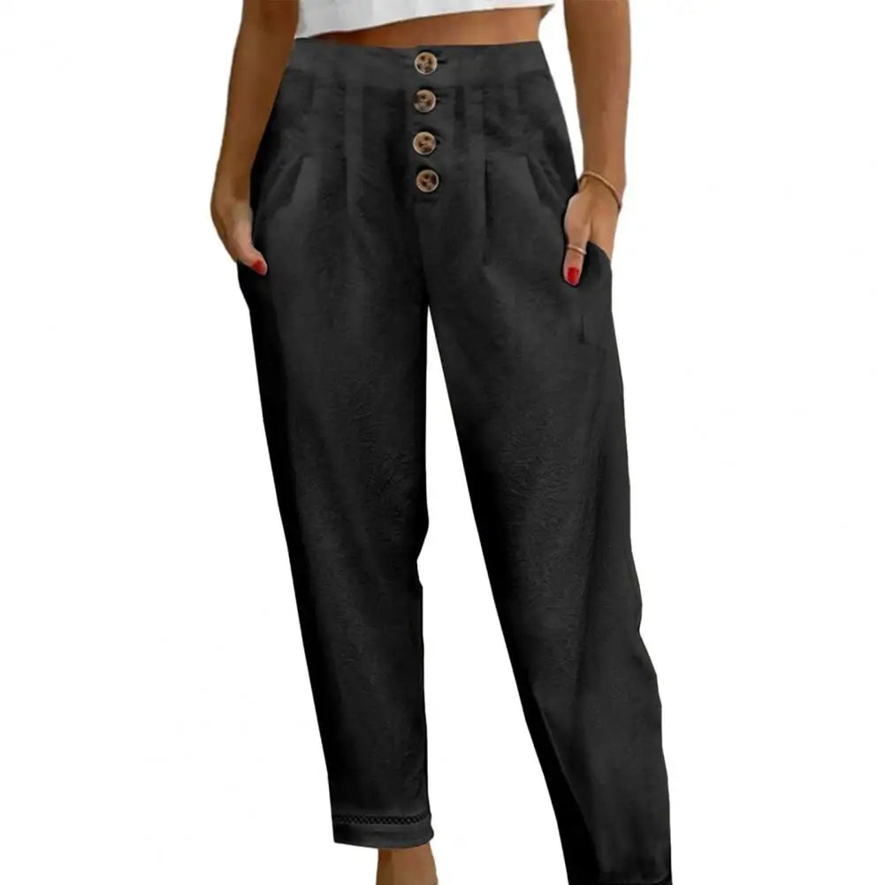 Damenhose schwarz, hohe Taille, Knopfverschluss, lässig, Baumwolle, modisch, bequem.