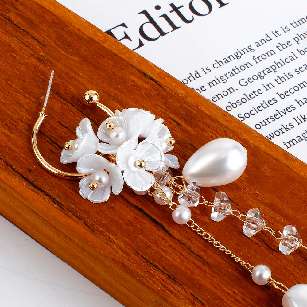 Diese böhmischen Perlen- und Kristallohrringe haben einen ausgesprochen raffinierten und romantischen Reiz, der erdig und von der Natur und der schönen Natur inspiriert ist. Dieses leichte Paar eleganter und femininer Ohrringe ist mit zarten Blumen, hochwertigen Kunstperlen und funkelnden Kristallen verziert.
