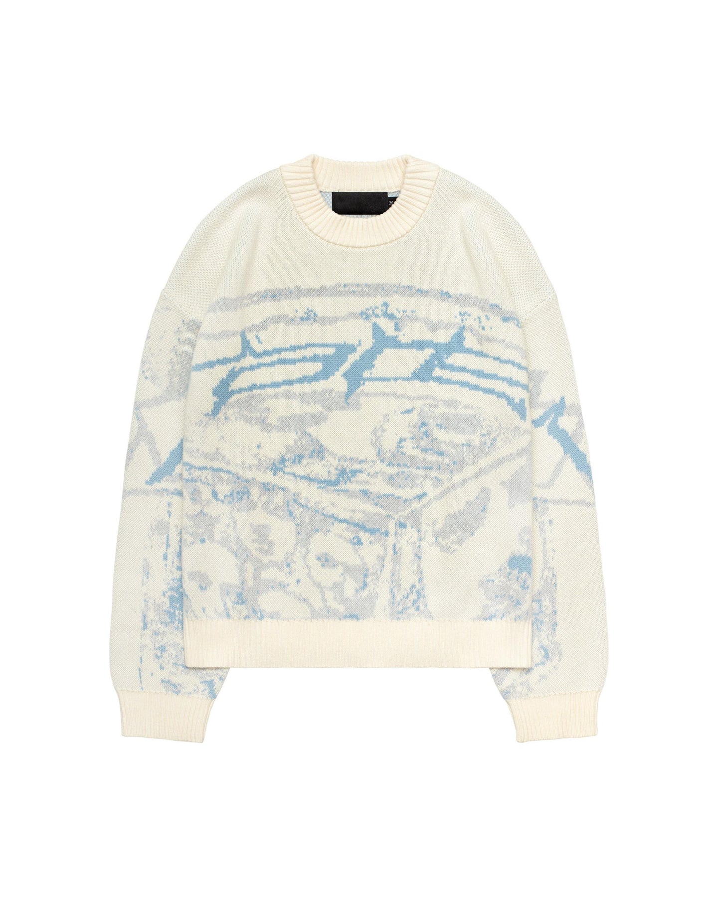 Cremefarbener Strickpullover mit blauem Muster, Rundhalsausschnitt, Baumwolle, Unisex-Mode.