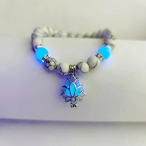 Erleben Sie Spiritualität und Stil mit unserem im Dunkeln leuchtenden Lotus-Charme Armband aus Naturstein mit heilenden, leuchtenden Perlen, die im Dunkeln leuchten. Das Armband ist mit einem zarten Lotusanhänger geschmückt, der Reinheit und Erleuchtung symbolisiert. Die mit Präzision gefertigte Kombination aus Natursteinen und dem subtilen Glanz schafft ein faszinierendes Accessoire, das Ihrem Ensemble einen Hauch von Mystik verleiht.