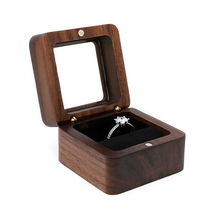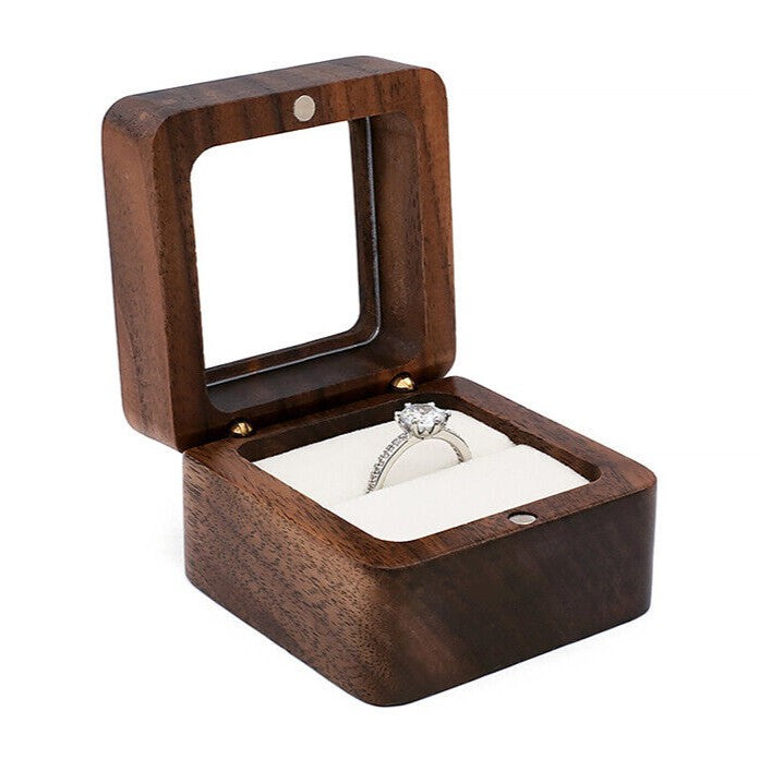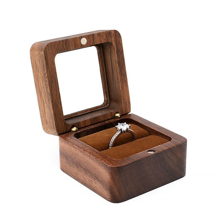 Holz-Ringbox mit Diamantring, Walnussholz, Schmuckaufbewahrung, elegantes Design, Geschenkidee.