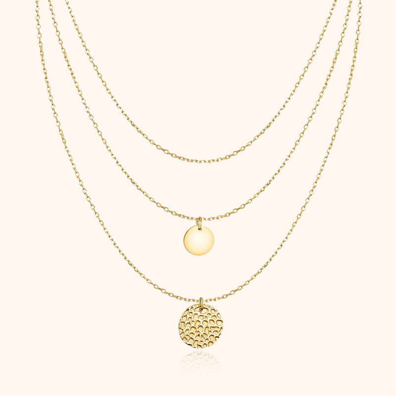 - Einzigartiges Design: Drei Kettenlagen mit stilvollen Kreisanhängern.