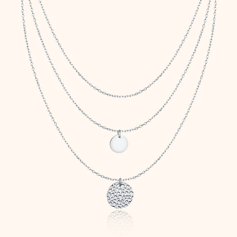 Unsere Aurora Mehrlagige Halskette vereint drei wunderschöne Ketten in einem einzigartigen Schmuckstück. Das Design umfasst zwei flache Kreise mit glatter Struktur und dezenten dekorativen Details. Hergestellt aus hochwertigem Silber und erhältlich in Silber oder 18K vergoldet, bietet diese Kette eine perfekte Kombination aus modernem Design und zeitloser Eleganz.