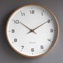 Runde Wanduhr, weißes Zifferblatt, schwarze Zahlen, goldene Zeiger, modernes Design.