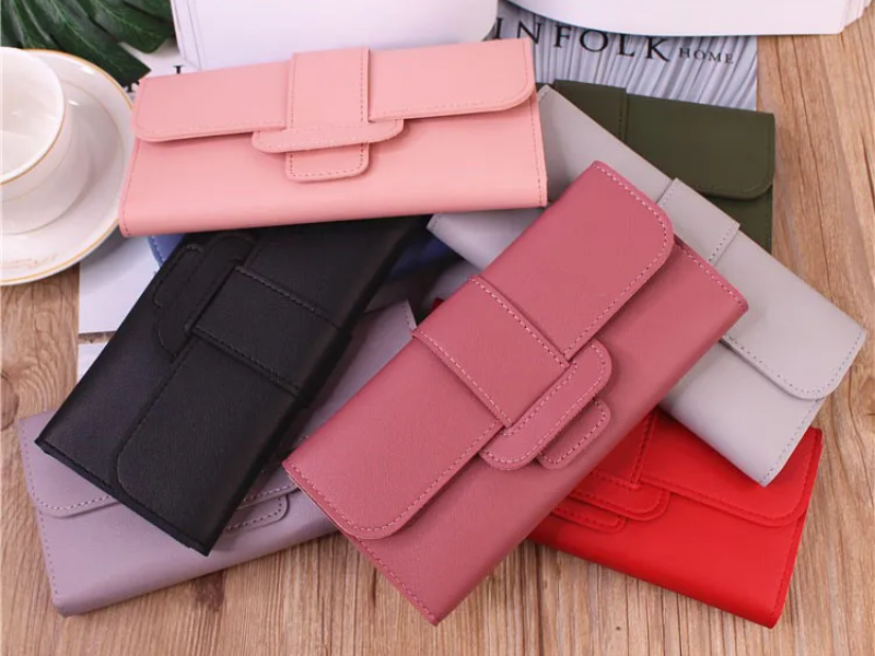 Verschiedene farbige minimalistische Lederportemonnaies auf Holztisch, elegant und stilvoll.