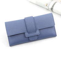 Blaue minimalistische Leder-Geldbörse, lang, elegant, für Damen, auf weißem Hintergrund.