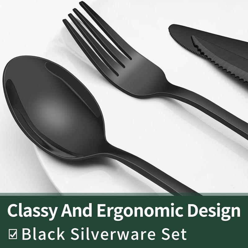 Erhöhe dein Esserlebnis mit dieser eleganten 24-teiligen schwarzen Besteckset, die entworfen wurde, um Eindruck zu machen und langlebig zu sein. Hergestellt aus lebensmittelechtem Edelstahl, bietet diese Besteckset für vier Personen alles, was du für alltägliche Mahlzeiten oder besondere Anlässe benötigst. Die Set enthält auch Steakmesser, die deiner Tafel einen Hauch von Stil und Vielseitigkeit verleihen.