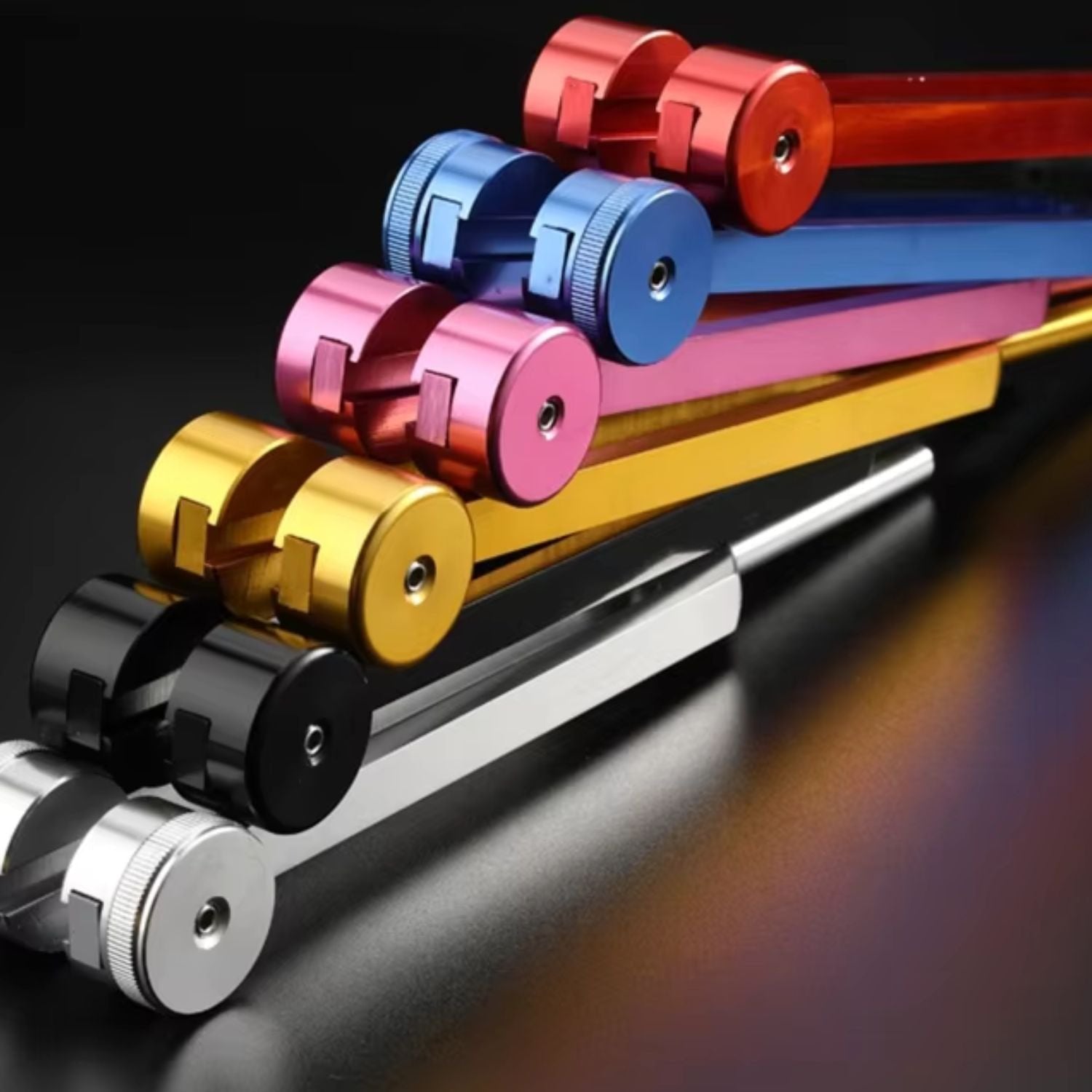 Bunte Aluminium-Stimmgabeln, 7-teiliges Set, Musik-Therapie, Schwarz, Silber, Rot, Blau, Gold.