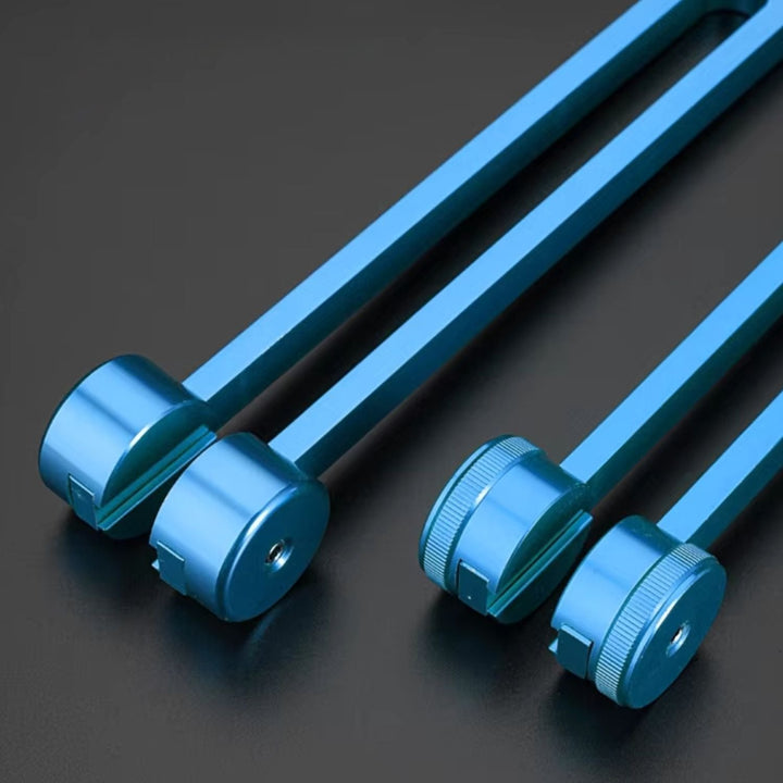 Blaues Stimmgabel-Set mit Holzklöppel und Inbusschlüssel, Klangtherapie-Instrument.