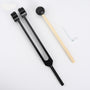 Schwarzes Stimmgabel-Set mit Holzklöppel und Inbusschlüssel auf weißem Hintergrund.
