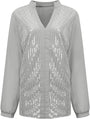 Erleben Sie lässige Eleganz mit der Plus-Size-Bluse mit V-Ausschnitt, einer vielseitigen und schicken Ergänzung Ihrer Garderobe. Diese Bluse hat eine lockere und bequeme Passform, die sowohl Stil als auch Bewegungsfreiheit bietet. Die langen Ärmel sorgen für einen Hauch von Raffinesse, während die Paillettenverzierung die Bluse für einen subtilen Hauch von Glamour aufwertet.