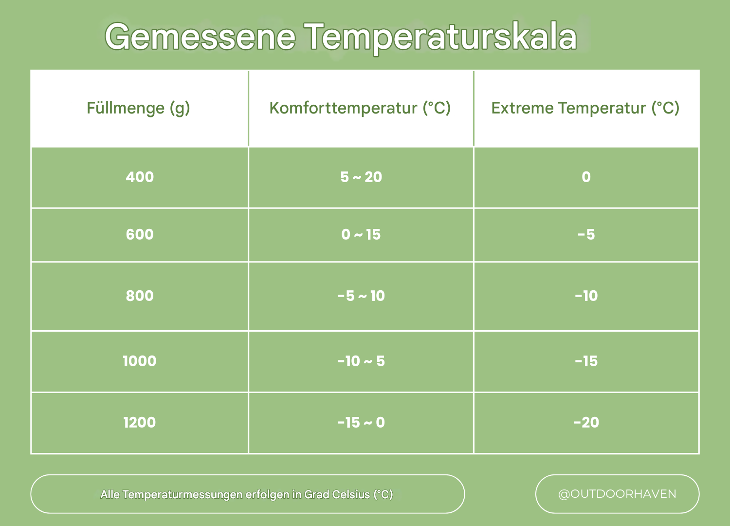 Temperaturskala Tabelle für Schlafsäcke, Komfort- und Extremtemperaturen in Grad Celsius.